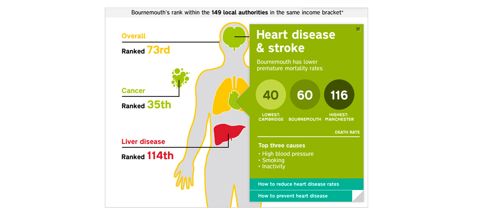 The primary audience for PHE’s Longer Lives are local health authorities in each borough in England; specifically high level directors and CEOs who set, budget, and manage health initiatives for their local constituents. But in order to drive discourse about certain issues surfaced with the data, the press and media is key to facilitating people’s (patients, health providers, policy makers) thoughts, experience, and expectation. It was also important to use social media to engage those who will be impacted by any decisions and actions taken by their health authorities to feedback on policy shortcomings and successes.