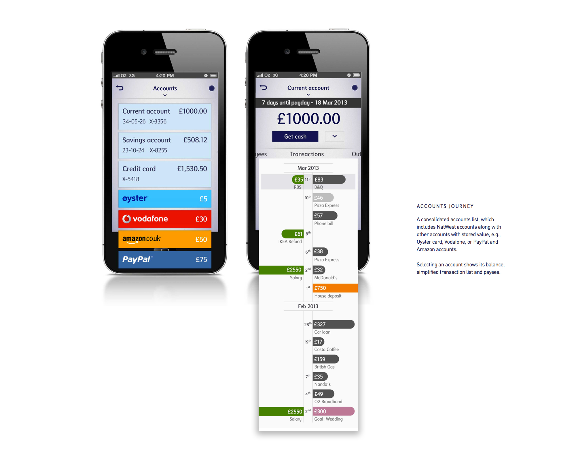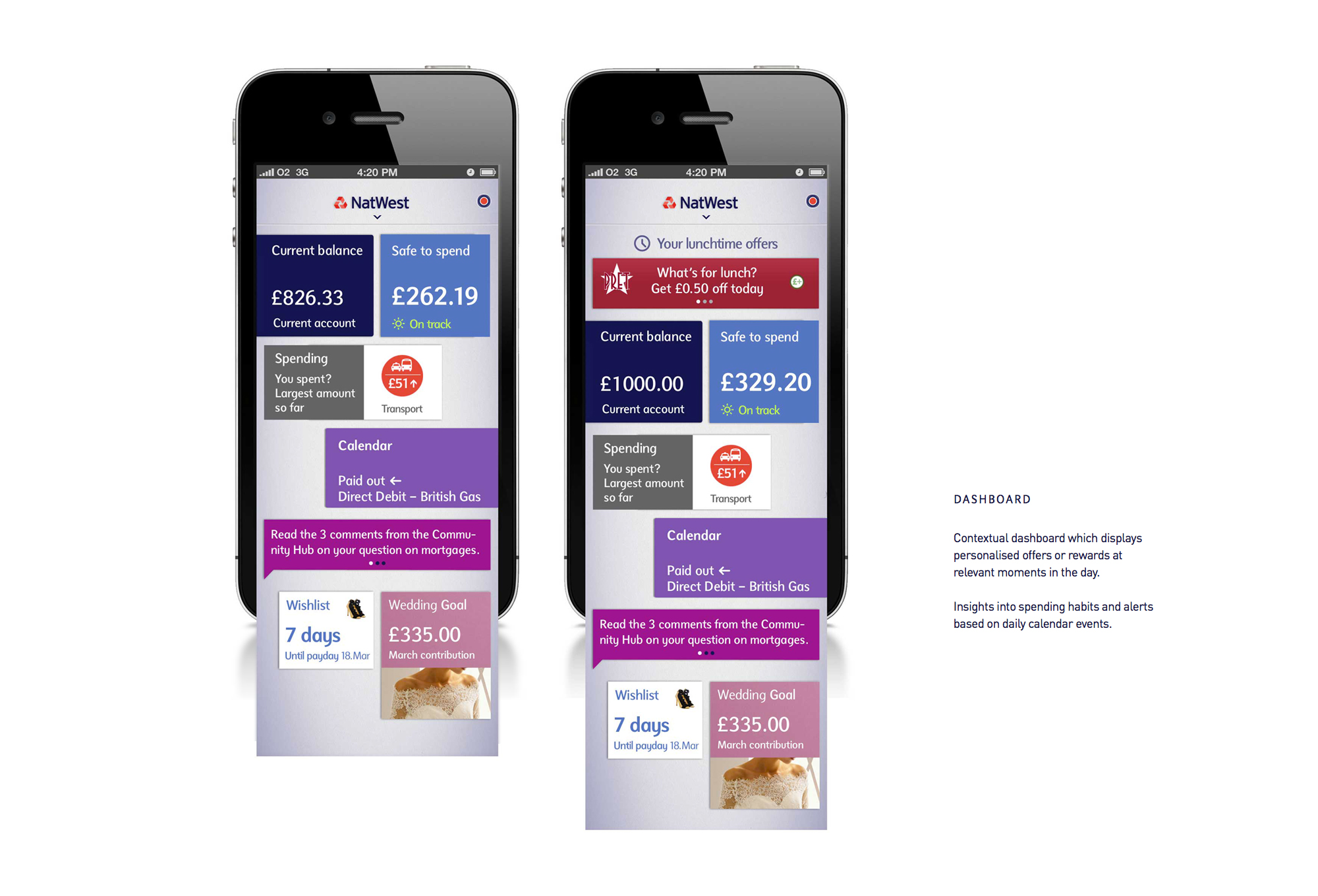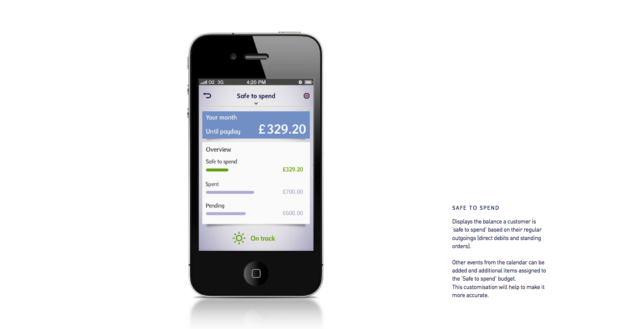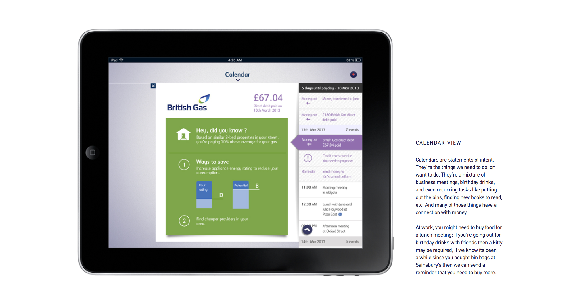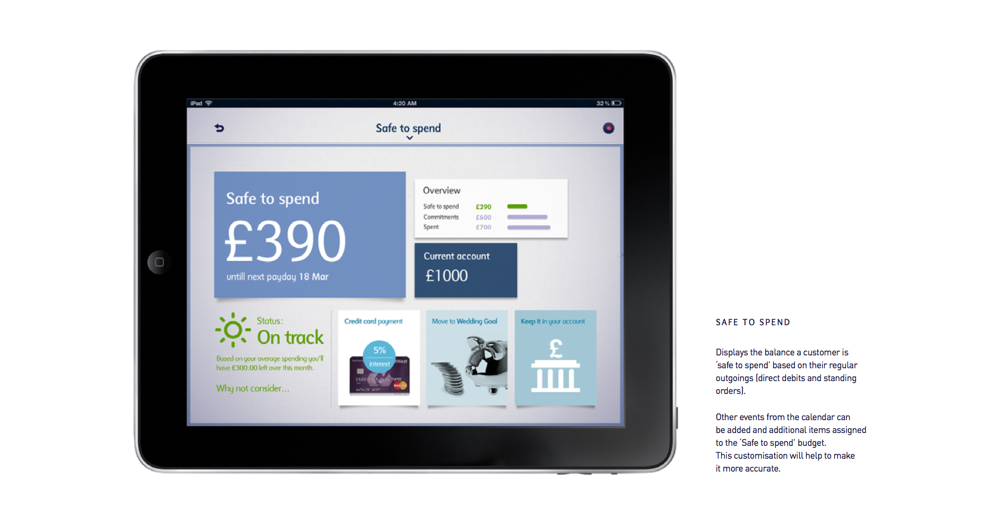 Customers need to be given insights into their finances that motivate them into taking action. The tablet experience provides a clearer view of a customer’s account and their financial trajectory: where they’ve spent their money, what they’ve spent it on and where they’re going. It helps them ignore the noise and focus on the important things, while implicitly encouraging them to think about making decisions and effecting change.