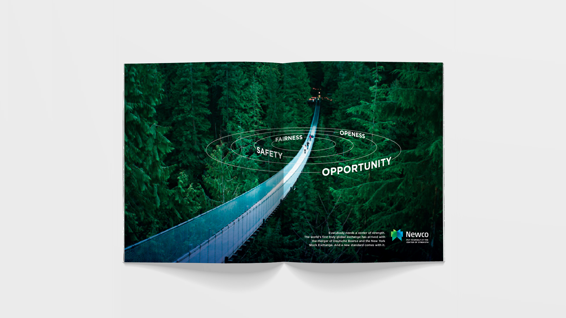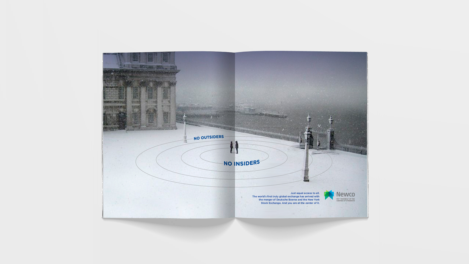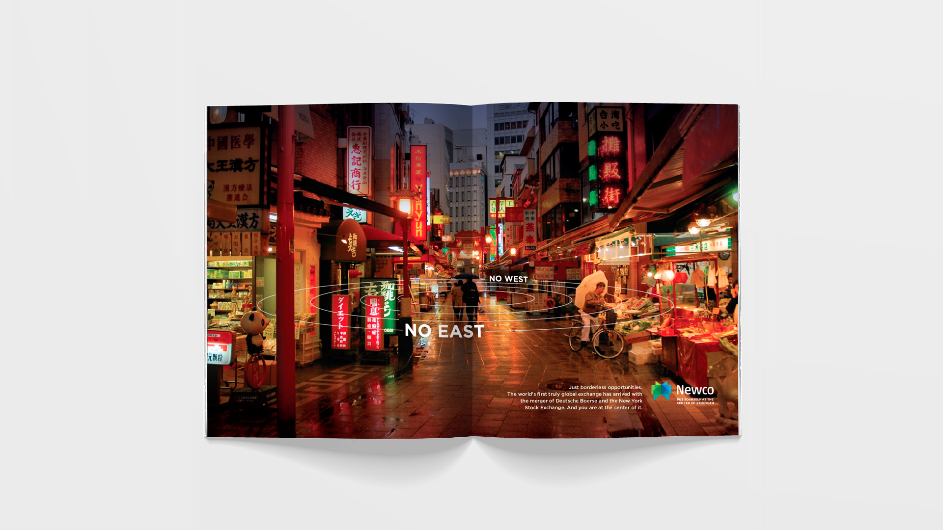 To pitch the pending merger of two of the world’s largest stock exchange platforms, a series of (re)branding ideas begins to herald a shift in paradigm. It foreshadows the next financial market evolution where notions such as “inside vs. outside” or “east vs. west” become 20th century artifacts in growing and managing businesses and investments. Using a surrogate name for the merging entities, teasers and launch ads message a new leveled playing field in finance on a global scale. Print, TV, OOH as well as digital ambient pieces promote the notion that this shift is now centered on the individual, giving them access to achieve unimaginable goals.