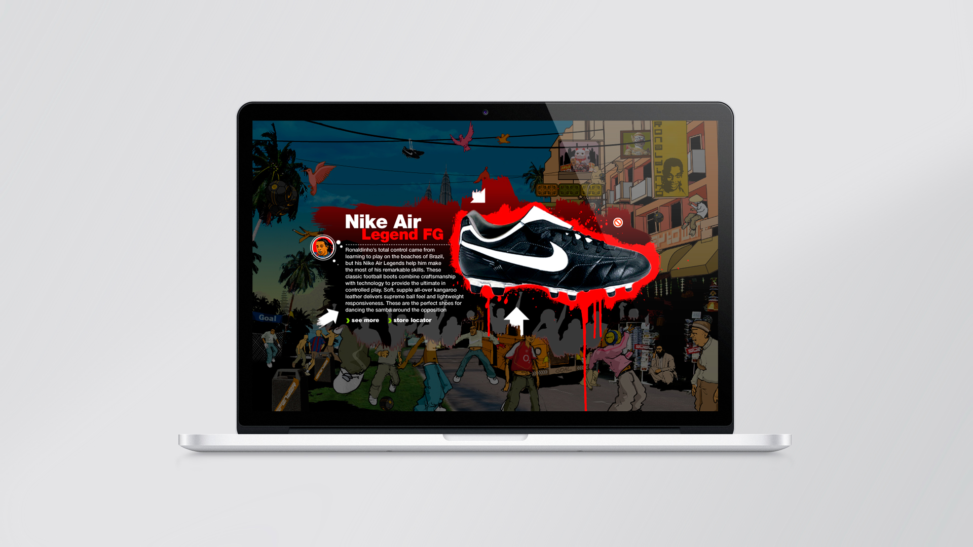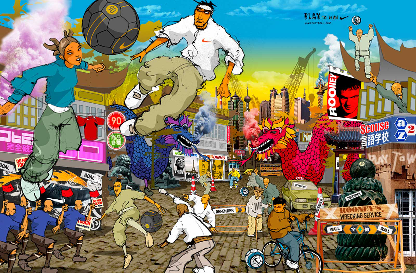 To promote Nike football (soccer) in Asia, the Play to Win campaign taps into attributes of three Nike footballers: Wayne Rooney (power & tenacity), Thierry Henry (speed & agility), and Ronaldinho (control & timing). Their respective hometowns of Liverpool, Paris, and Porto Alegre’s street-ball style of improvisational football are transported to the urban metropolis of Shanghai, Tokyo, and Kuala Lumpur. Each location is alive as a highly animated and interactive scene with clickable hot spots that reveal product and athlete stories with hidden game contest easter-eggs to level-up and unlock sharable content. Football is viscerally branded in the flavor of Nike to inspire people and challenge them to adopt the mindset of improvisational football—to play anywhere and play to win.